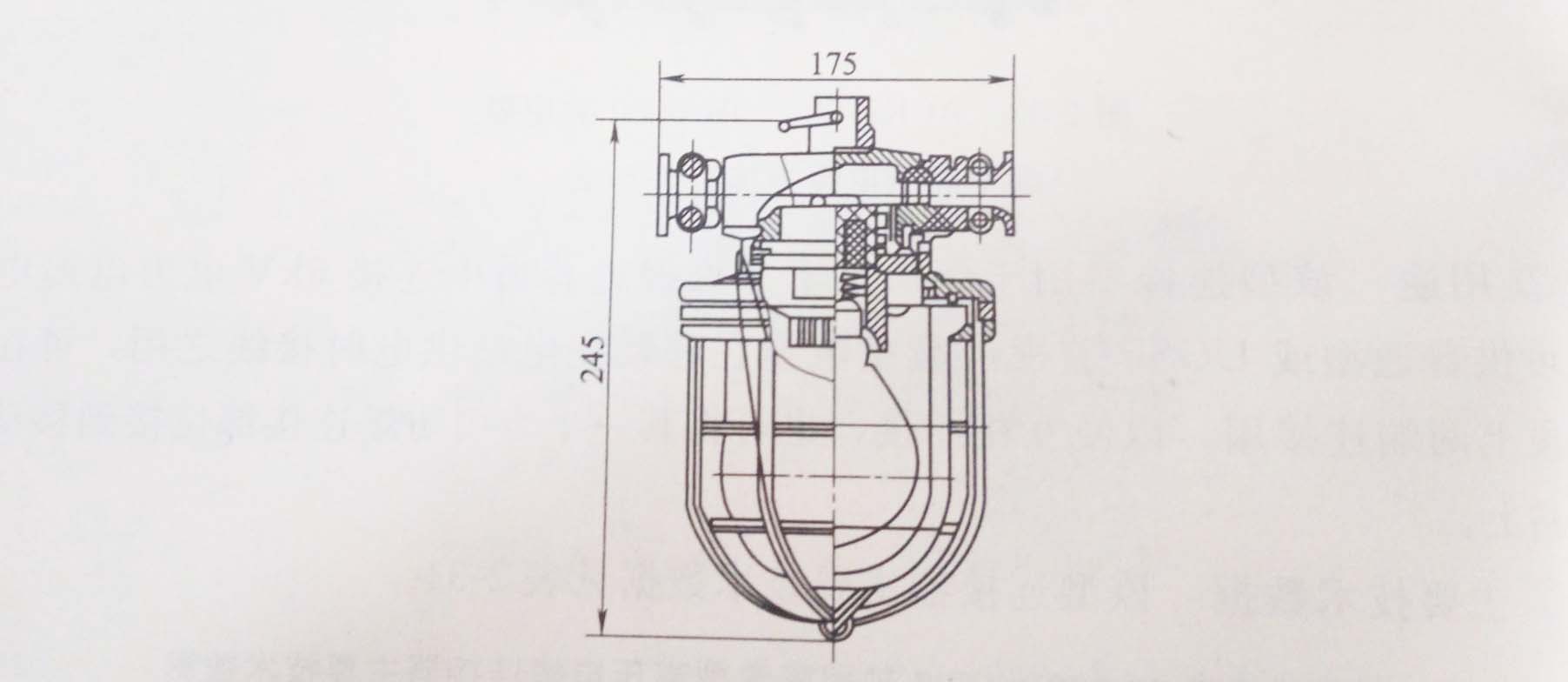 KBB-60型礦用隔爆型白熾燈由外殼、鋼化玻璃罩、保護網(wǎng)等部分組成。外殼采用高強度ZLl02鑄鋁鑄成。燈座設(shè)有斷電聯(lián)鎖裝置,當(dāng)保護網(wǎng)轉(zhuǎn)過30。時就 能自動通電,如果退回30°就能自動斷電,且能卸下鋼化玻璃罩以便更換燈泡。外形尺寸見圖2-34。